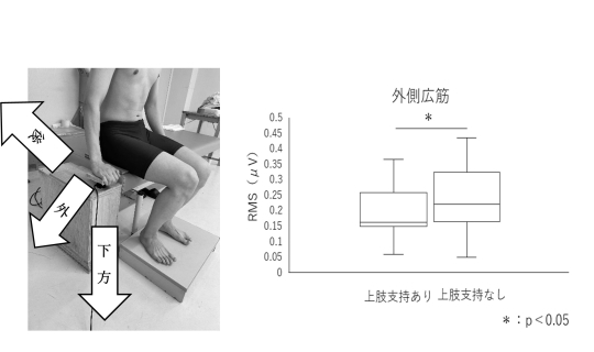 本研究の結果から、臨床場面において、外側広筋を中心とした膝関節伸展筋力低下を認める症例では、上肢で支持面を押すように口頭指示を行うことで、立ち上がり動作が遂行できるようになる可能性が示唆されました。